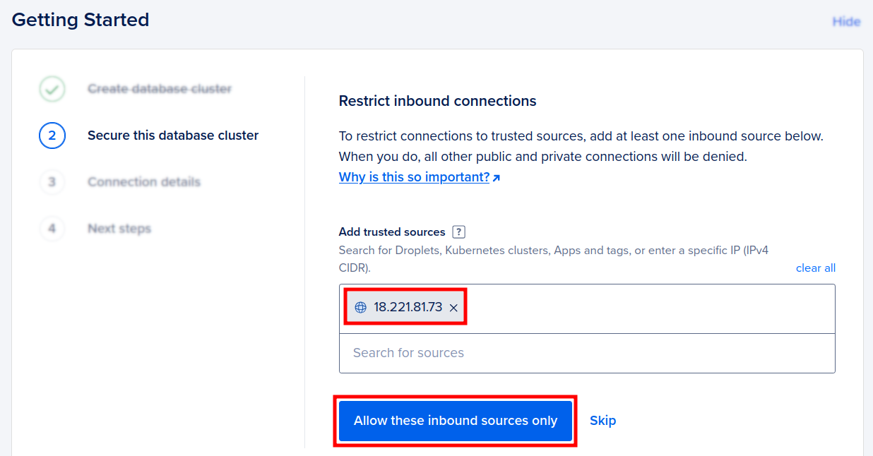 In the Secure this database cluster screen add to the inbound rules the Rocketadmin IP address - 18.221.81.73, as trusted source, granting us access to your database: