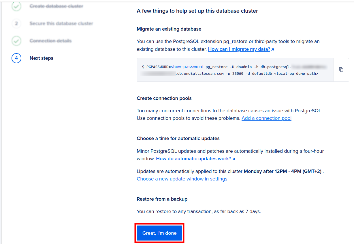 In the next screen you can review the DigitalOcean instructions on how to migrate an existing PostgreSQL database to this cluster: