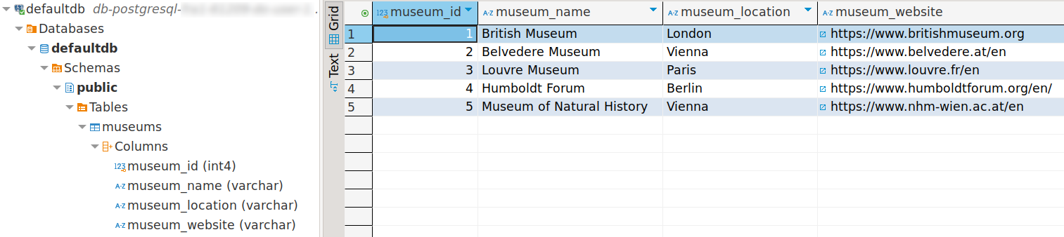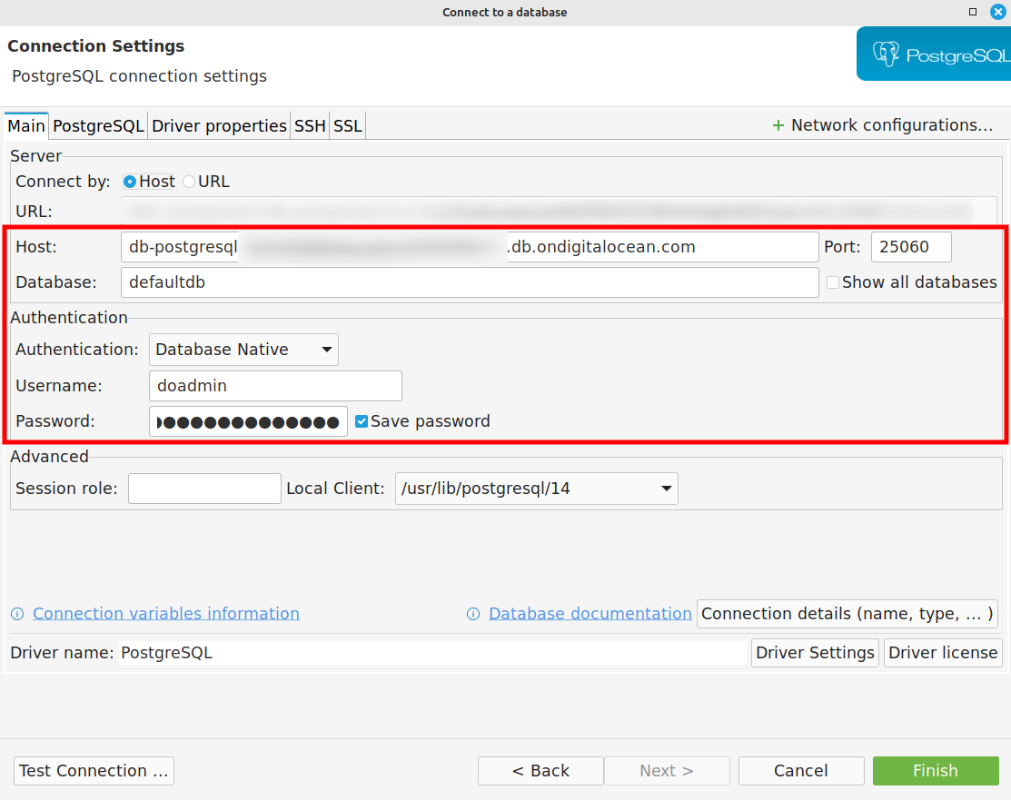 Using your database management tool create a connection to the DigitalOcean cluster by providing the following data: