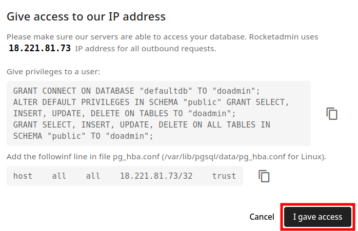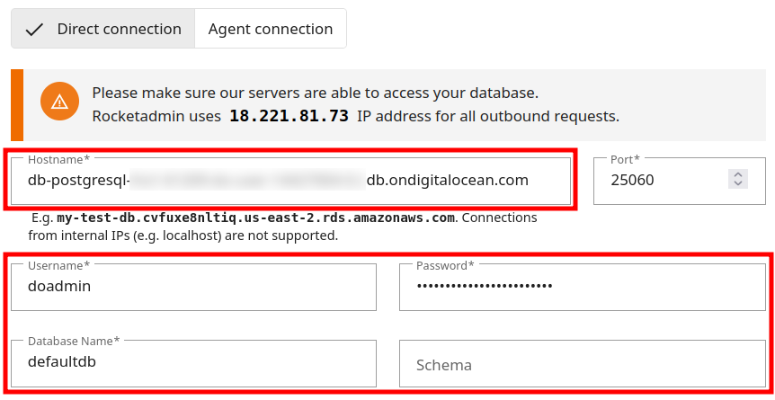 The final steps of this guide include creating a Rocketadmin connection to the DigitalOcean PostgreSQL managed database. Follow the guidelines: