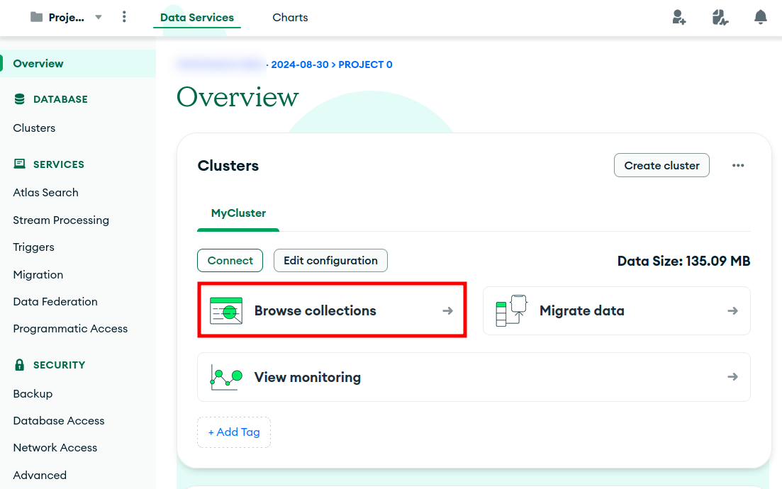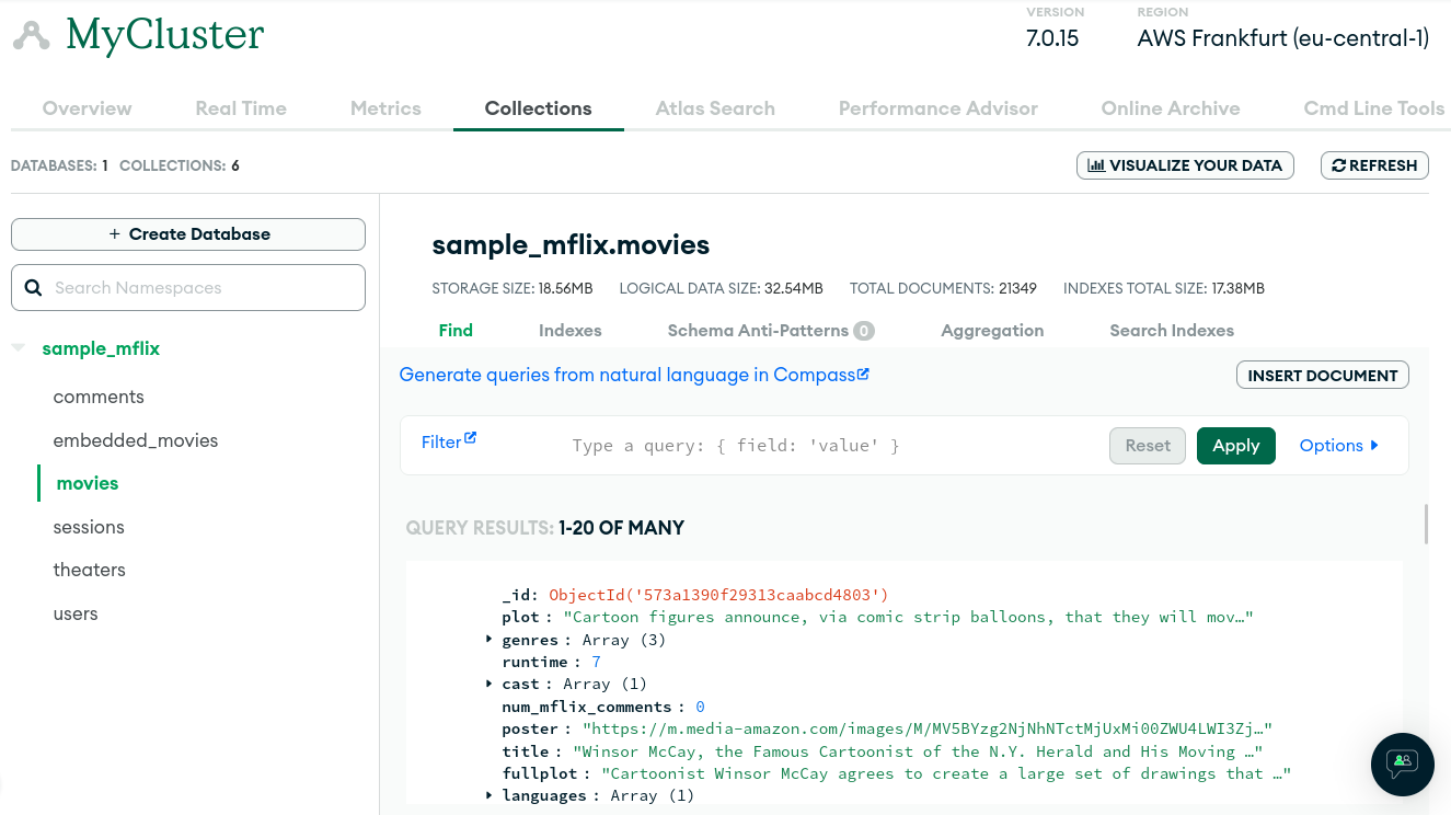 From the Overview screen you can click on Browse collections to review the sample data loaded during the cluster setup: