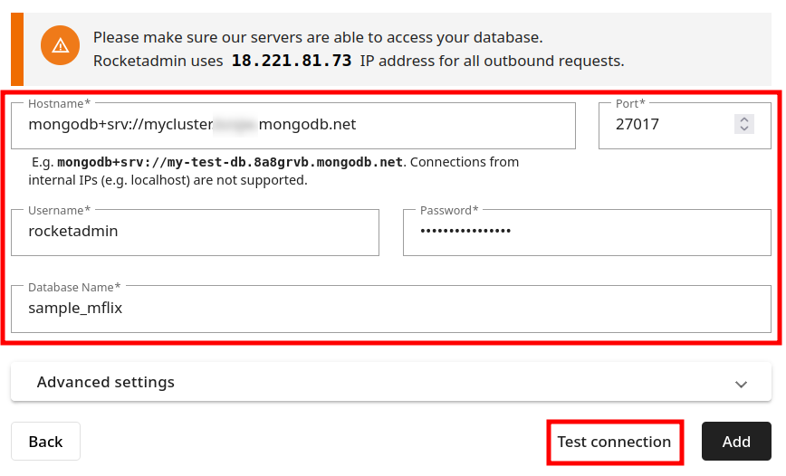 The final steps of this guide include creating a Rocketadmin connection to the MongoDB cluster and review the sample data. Follow the guidelines: