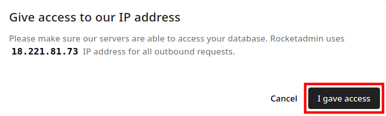 Click on I gave access since the Rocketadmin IP address has already been added to the security settings.