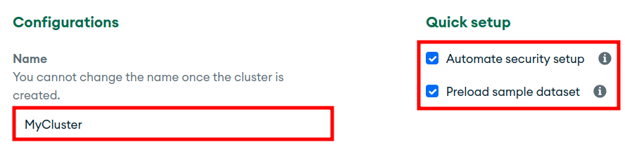 Enter a name for your cluster and mark the options: Automate security setup and Preload sample dataset: