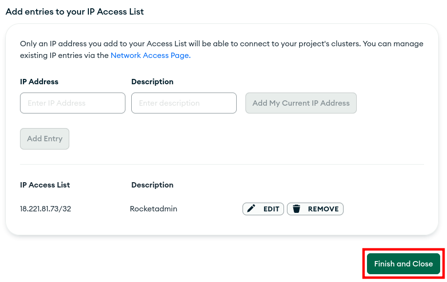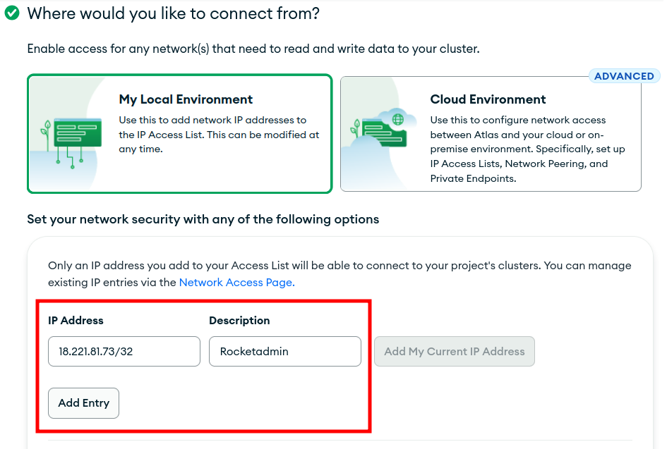 In the next network security settings specify the Rocketadmin IP address - 18.221.81.73/32 as trusted source, granting us access to your database, and click on Add Entry: